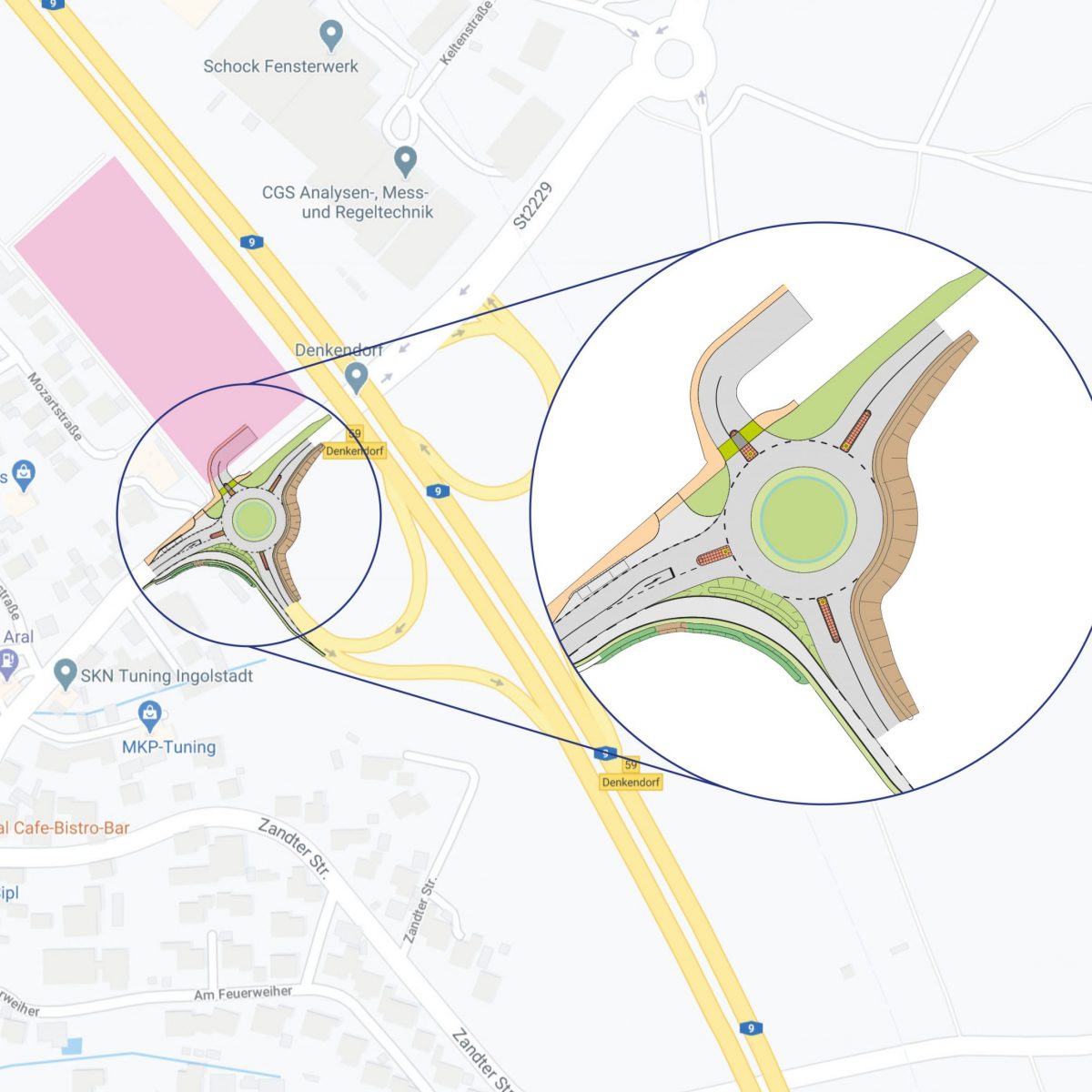 Daher wurde bereits zu einem sehr frühen Zeitpunkt mit einem Verkehrsgutachten untersucht, wie sich die Verkehrsströme in Zukunft entwickeln werden. Wie es auch das allgemeine Empfinden vor Ort erwarten lässt, ist die St 2229 am östlichen Ortsrand von Denkendorf aktuell bereits stark belastet. Der Kreuzungsbereich ist durch die aktuelle Gestaltung ein potentieller Unfallschwerpunkt.  Täglich fahren hier 10.800 Fahrzeuge am Knotenpunkt vorbei, im Bereich der Autobahnunterführung sind es sogar 13.600 Fahrzeuge. Durch die Einmündung der Autobahnauffahrt kommt es  – insbesondere in den Morgen- und Abendstunden –  zu Verkehrsspitzen, dichtem Verkehr und Wartezeiten. Fachplaner sprechen hier von sogenannten Qualitätsstufen, mit denen Verkehrsknotenpunkte bewertet werden und die auf einer Skala von A (sehr gut) bis F (ungenügend) liegen. Derzeit entspricht der Verkehrsknotenpunkt der Qualitätsstufe D am Abend und sogar E am Morgen. Es liegt daher Nahe, dass eine Verbesserung der Verkehrssituation angebracht ist.